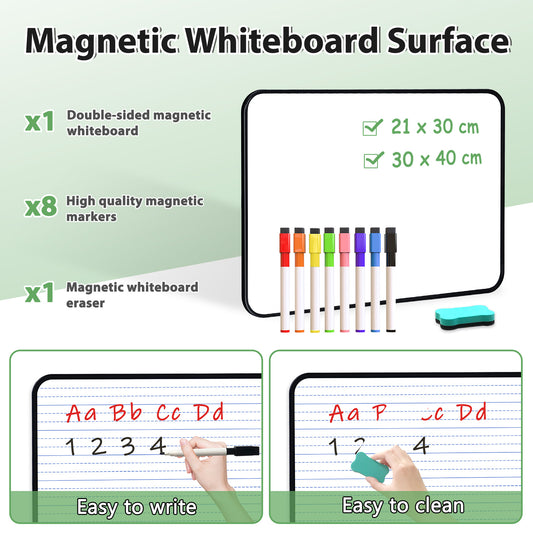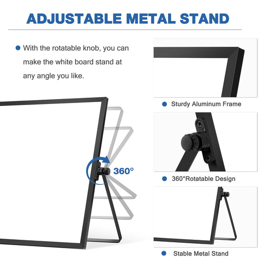 Small White Board with Stand, 16" x 12", Double-Sided with 8 Markers 8 Magnets 1 Eraser-Black