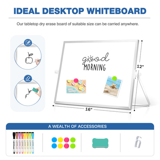 Small White Board with Stand, 16" x 12", Double-Sided with 8 Markers 8 Magnets 1 Eraser-Silver