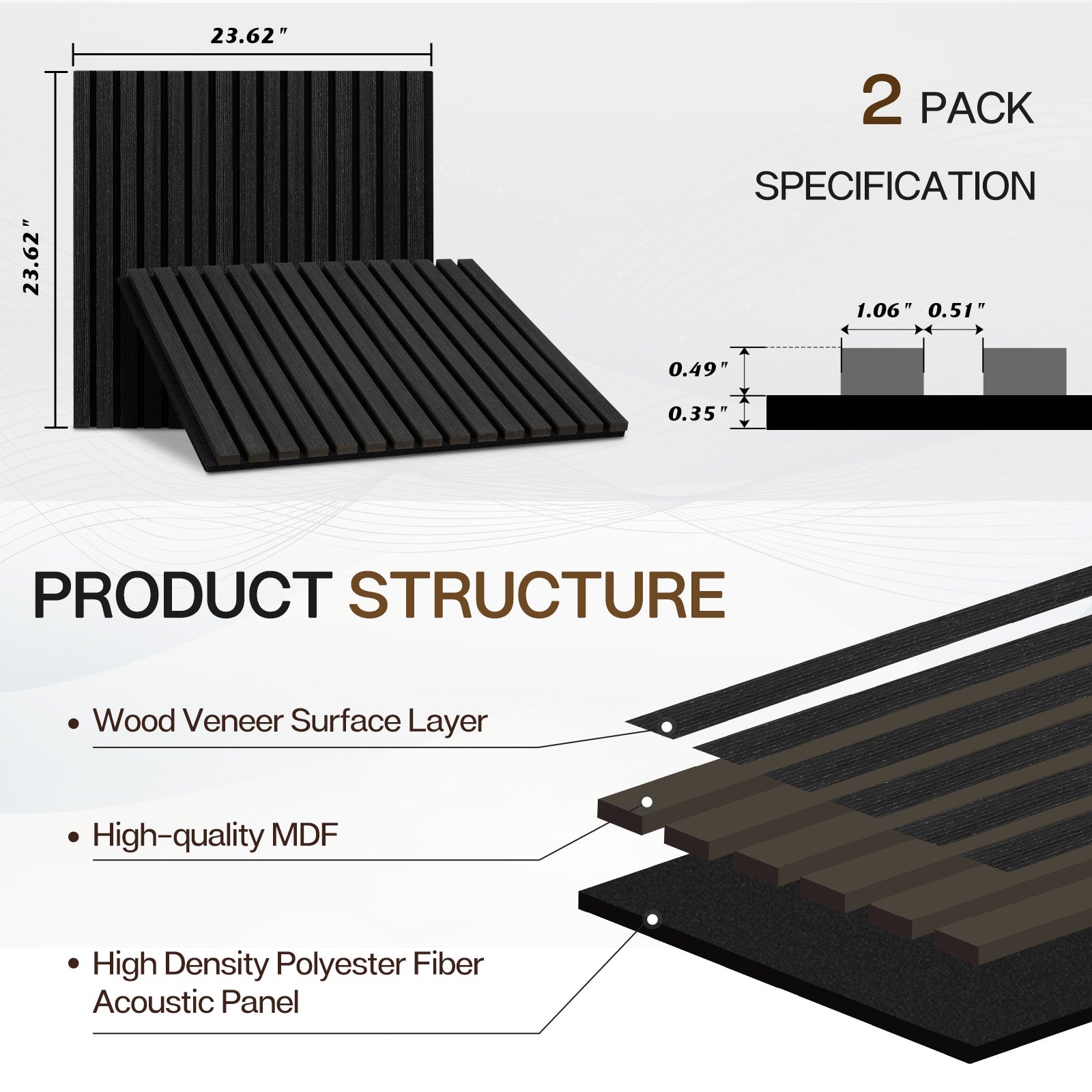 Wood Slat Acoustic Panels for Wall, 23.6" x 23.6" 2Pcs, Black Oak