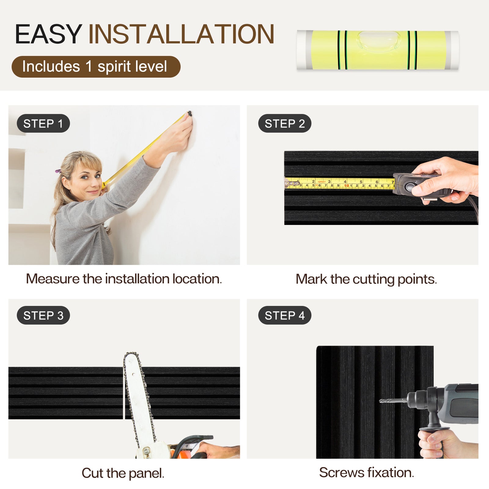 Slat wall panels are installed in a convenient way, each set of wood wall panels comes with screws to make the installation process easier and less time-consuming. You can also use glue to stick them to the wall.